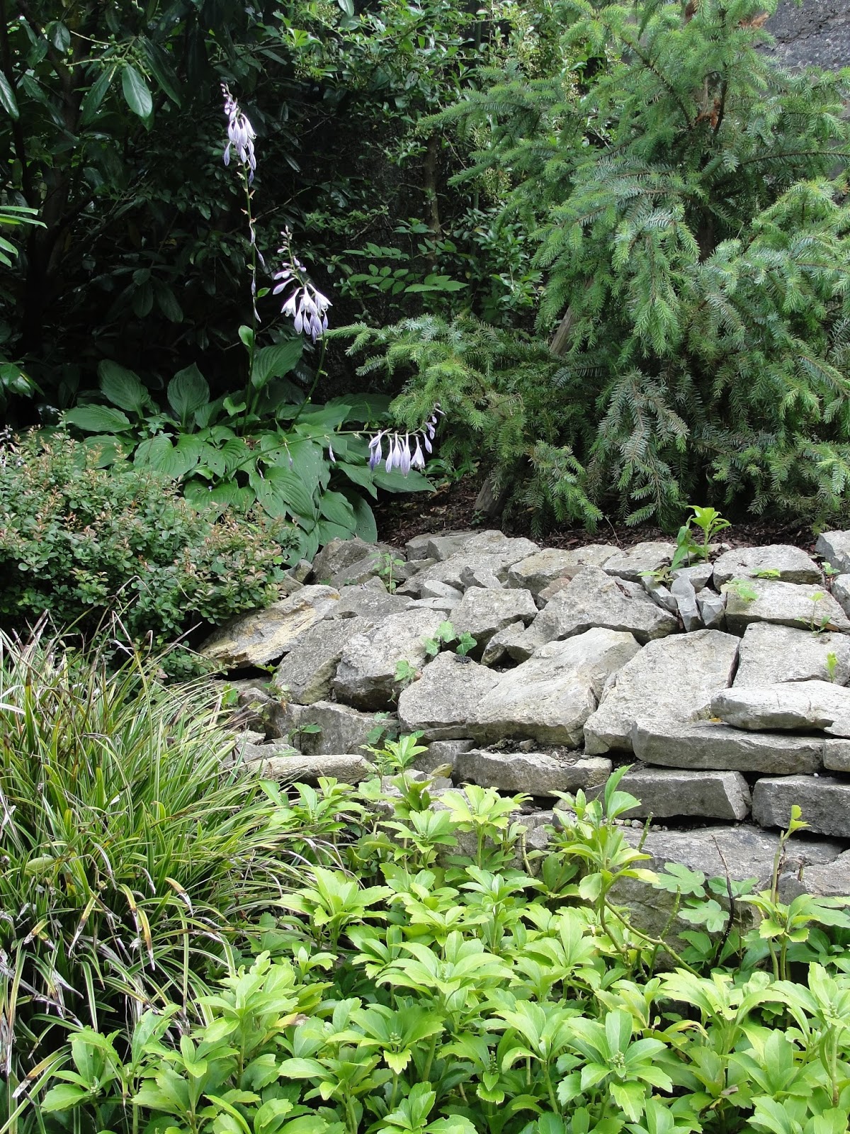 This is the bottom of level 1. He built all the walls and steps himself. There is some variety of greens growing on the edge of the walls. At the top of the photo is the gate that leads to the road.